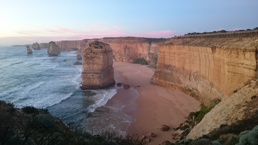 Nach Apollo Bay nimmt die Dichte der „Scenic Lookouts“ nochmals zu, denn ab hier reiht die Landschaft spektakuläre Felsformationen aneinander, wie die 12 Aposteln, Loch Ard Gorge oder die London Bridge. Und auch die Touristenmassen nehmen zu, v.a. zu den 12 Aposteln (siehe Titelbild) strömen herscharren von Touristen. Die Nacht verbringen wir wieder auf einem privaten Campingplatz, ganz in der Nähe. Da lassen wir es uns nicht nehmen, die 12 Apostel bei Sonnenuntergan zu sehen, entgegen der Annahme, dass dann weniger los wäre, finden sich auch bei Sonnenuntergang massen von Touristen dort ein. Aber wie kann man es ihnen übel nehmen. Zum einen gehören wir ja auch dazu und zum anderen ist der Anblick der untergehenden Sonne einfach wunderschön, ebenso wie sich die Farben der Felsen im Licht verändern, bis sie schließlich in der Dunkelheit verschwinden.
