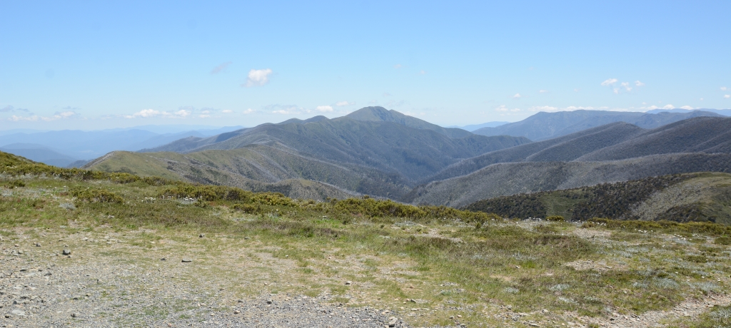 Nach Omeo werden die Straßen nochmals steiler bis man hinter Hotham Heights den höchsten Punkt der Great Alpine Road erreicht, The Cross, 1845m. Von hier hat man einen unbeschreiblich weiten Blick über die Region. Das Landschaftsbild ist karg, das saftige grün hab ich schon vor einigen Kilometern hinter mir gelassen und durch die wenigen Touristen wirkt alles viel einsamer und weiter.